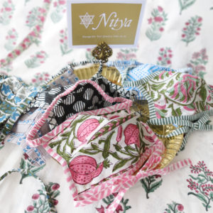 インド北西部に伝わる伝統的な布に柄をつける手法として世界中に愛されるハンドブロックプリント。ハンドブロックプリントの布は職人による木版画のスタンプ作業によって色毎に版を押され一つ一つ製作されています。手作業で行われているので柄は全て微妙に異なり独特の風合いを生み出しています。マスクは2層式で内にフィルターを入れられるポケット付き。6種類の柄には伝統的な植物柄や幾何学文様があり、マスクを身に着ける楽しみを与えてくれます。
